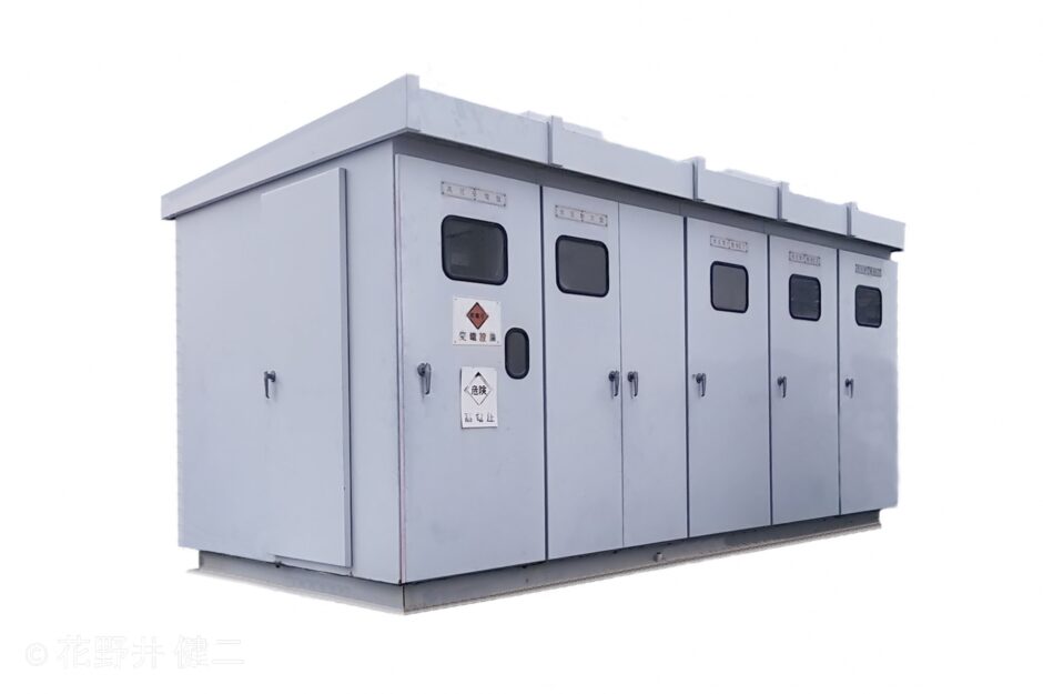 キュービクルは、高圧で供給される電力を建物内で使用できる低圧に変換する「受変電設備」を金属製の箱に収めたものです。