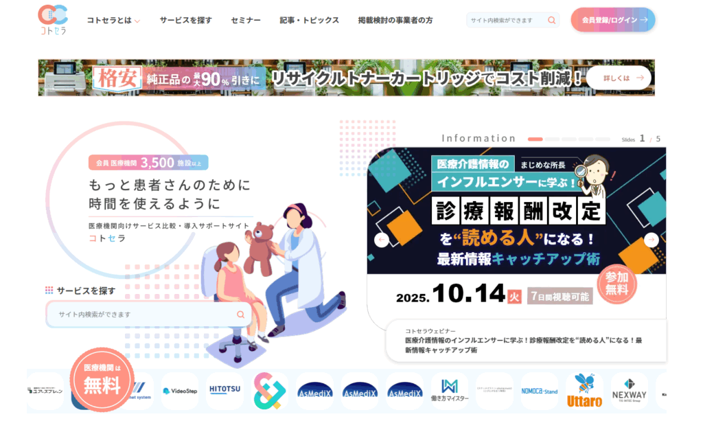 モノからコトへ――― 令和に入りCOVID-19対応、経営収支悪化、医師の働き方改革、デジタル化推進の流れなど、医療業界にとって新たな環境変化の時代が訪れています。 日々刻々と変化する日本の医療のあらゆる“コト”に向き合う医療機関の皆さまのニーズに応えるべく、“セラー(貯蔵室[cellar])”に新技術やソリューション情報を蓄え、皆さまの情報収集を支援するサービスが“コトセラ”です。