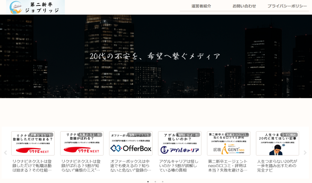 第二新卒としての転職に悩んでいる方や、今の働き方に迷いを感じている20代の方に必見のメディアです。