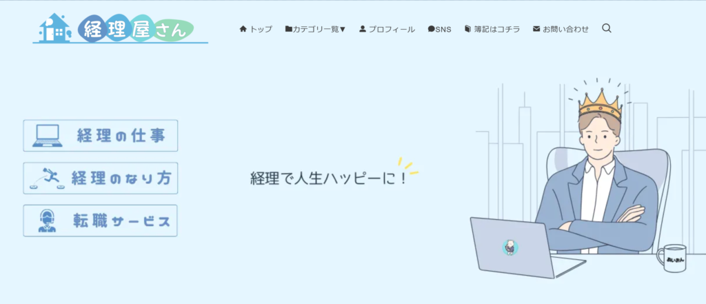 「経理屋さん」は、経理職を目指す人や実務で悩む人に向けた専門ブログです。経理の仕事内容や必要スキル、未経験からの転職方法、職務経歴書の書き方など、経理に関する幅広い情報を、経理部員の視点から丁寧に解説しています。運営者「あいおん」自身が未経験から簿記合格・転職成功を経験しており、その体験に基づく実践的ノウハウや、転職エージェントの比較・活用術も紹介。未経験者でも理解しやすく、経理への一歩を支える情報が満載のブログです。