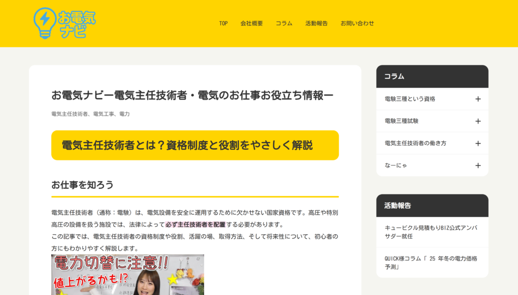 「お電気ナビ」は、電気主任技術者(通称:電験)や電気関連の仕事に役立つ情報を提供する専門サイトです。電気設備の安全な運用や法律で定められた高圧・特別高圧設備の管理に関する基礎知識、資格取得のポイント、現場で役立つ実務ノウハウなど、電気技術者としてのキャリアアップを支援するコンテンツを幅広く掲載しています。初心者から経験者まで、電気業界で働く人が知っておきたい情報がわかりやすくまとめられている情報ナビサイトです。