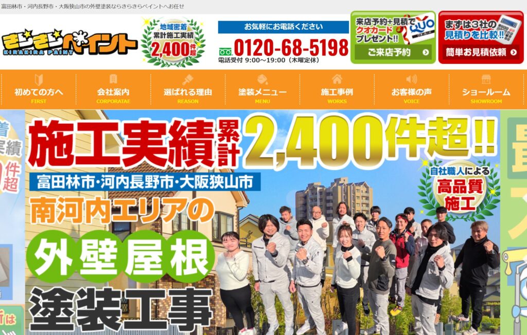 「きらきらペイント」は、大阪府南河内エリア(富田林市・河内長野市・大阪狭山市をはじめ近隣地域)を中心に展開する 外壁・屋根塗装の専門店 です。累計2,400件以上の豊富な施工実績を持ち、熟練の自社職人による丁寧な手塗り仕上げと、わかりやすい診断書・見積書の提示で安心・高品質な塗装サービスを提供しています。外壁・屋根塗装の各種プランやカラーシミュレーションが選べ、ショールームで専門スタッフが詳しく相談にも対応。無料見積もり・診断も受け付けており、初めての塗装でも安心して依頼できる地域密着型のサービスです。