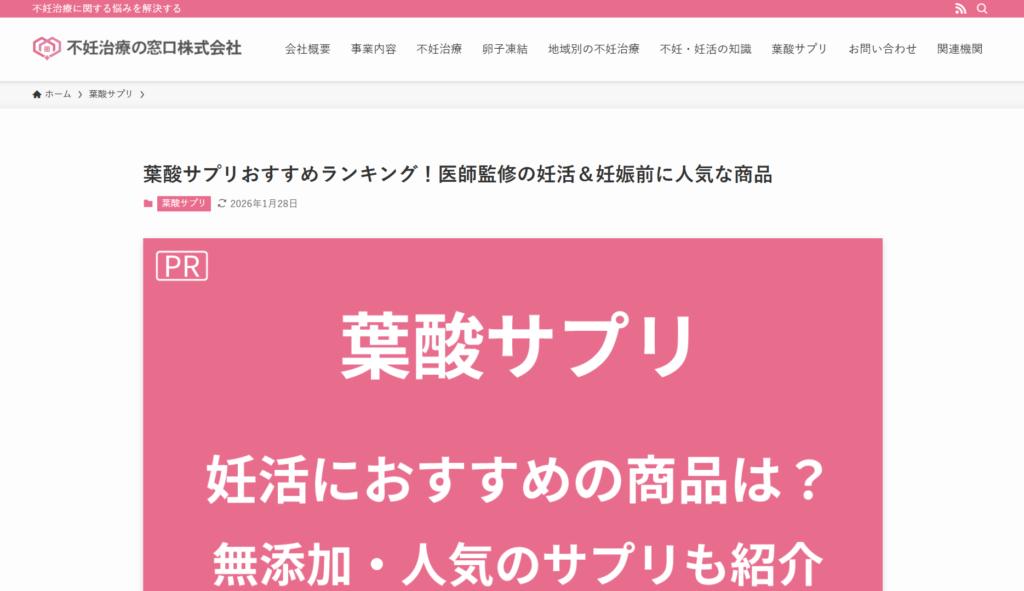 不妊治療の窓口株式会社が運営する「葉酸サプリおすすめランキング」は、妊活中の方が葉酸サプリを検討する際に役立つ基礎知識や選び方を分かりやすくまとめた情報サイトです。