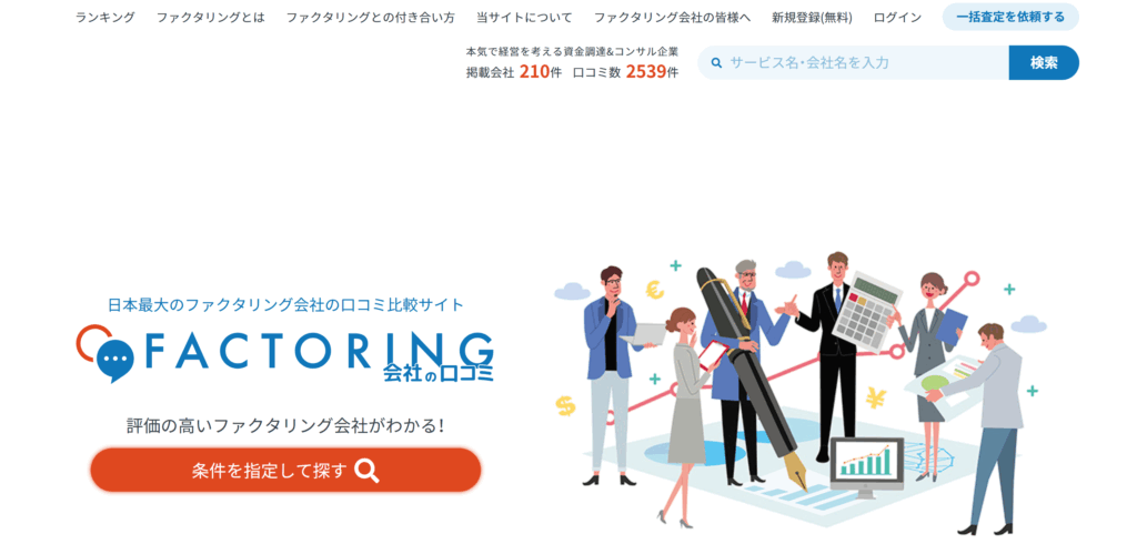 ファクタリング会社の口コミ」は、ファクタリング会社の 口コミ・評価を比較できるランキングサイト です。210社以上を掲載し、利用者からのレビューや評価(約2,539件)をもとにランキング表示。手数料・入金スピード・契約方式などで検索でき、最適なファクタリング会社を探すための情報プラットフォームとして機能しています。