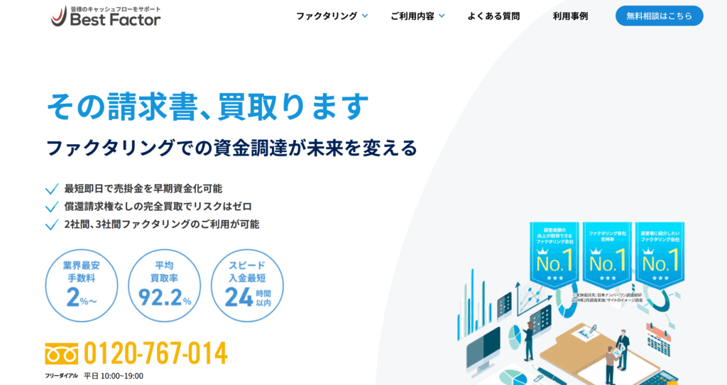 ベストファクター(BestFactor)」は、請求書(売掛金)を買取るファクタリングサービスを提供する会社のサイトです。最短即日で資金化可能、償還請求権なしの完全買取、2社間・3社間ファクタリング対応、手数料は業界水準(2%~)など、スピード・安心性を打ち出して事業者の資金繰りをサポートしています。
