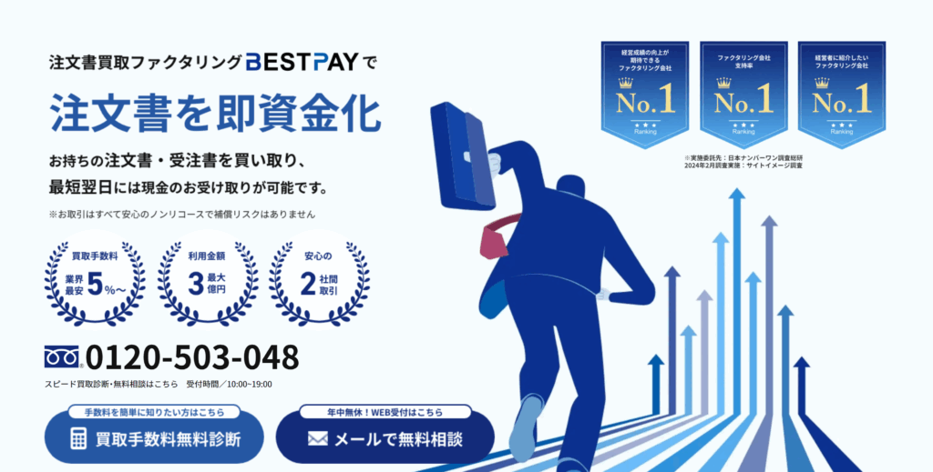 BESTPAY(ベストペイ)」は、受注した注文書・発注書を即座に現金化する 注文書買取型ファクタリング サービスを提供するサイトです。最短翌日入金、手数料は5%~、ノンリコース(償還請求権なし)で発注者の承諾不要という特徴を打ち出し、中小企業の資金繰り改善を支援しています。