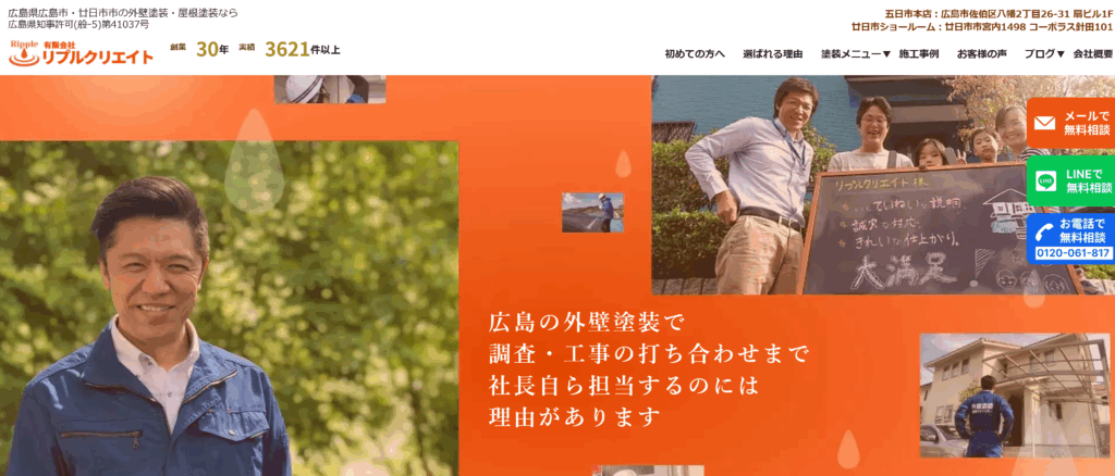 広島市・廿日市市に地域密着したリプルクリエイトは、創業30年、3600件以上の実績を持つ外壁・屋根塗装専門業者です。